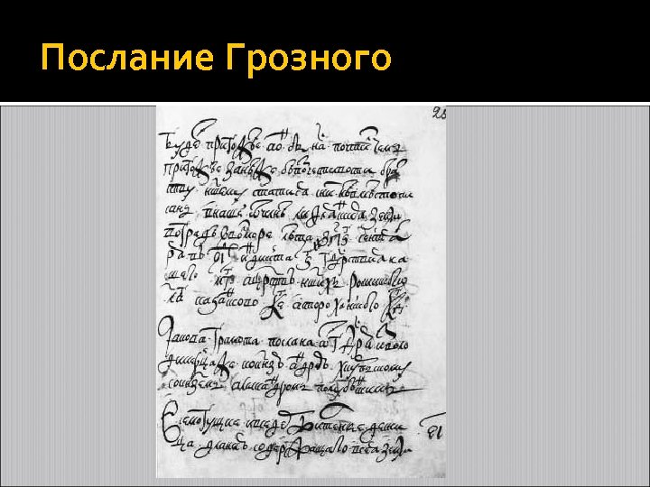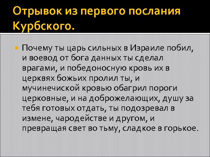 Отрывок из первого послания Курбского. Почему ты царь сильных в Израиле побил, и воевод от бога данных ты сделал врагами, и победоносную кровь их в церквях божьих пролил ты, и мучинечиской кровью обагрил пороги церковные, и на доброжелающих, душу за тебя готовых отдать, ты подозревал в измене, чародействе и другом, и превращая свет во тьму, сладкое в горькое.