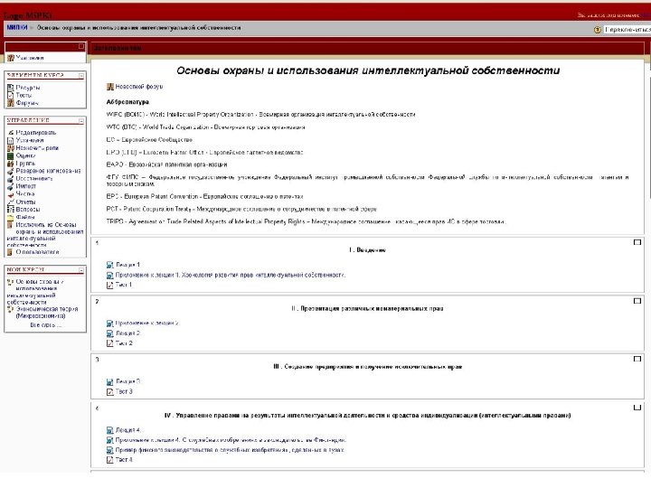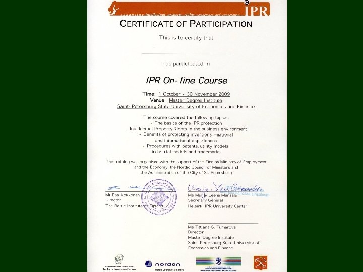 Разработчики он-лайн курса «Основы охраны и использования интеллектуальной собственности» с российской стороны: • • Санкт-Петербургский Государственный Университет Экономики и Финансов Санкт-Петербургский Государственный Университет низкотемпературных и пищевых технологий Межотраслевой Институт Подготовки кадров и Информации (предоставление сервера и программное обеспечение) 10 декабря 2009 г.