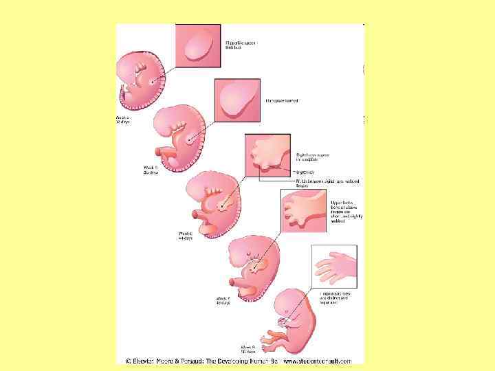 • На 7 -й неделе видны зачатки пальцев, вначале они соединены, на 8 -й неделе происходит их разделение за счет гибели клеток путем апоптоза в области межпальцевых промежутков.