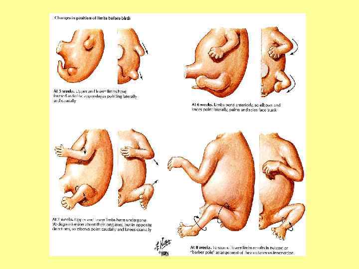 Положение конечностей • Вначале направлены к вентральной поверхности туловища. • Поворот: верхние - на 90º наружу, нижние – на 90º внутрь. • В результате сгибательная поверхность плеча обращена вперед, бедра – назад.