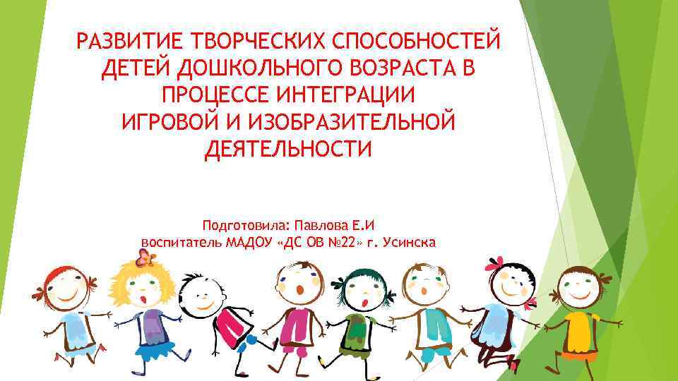РАЗВИТИЕ ТВОРЧЕСКИХ СПОСОБНОСТЕЙ ДЕТЕЙ ДОШКОЛЬНОГО ВОЗРАСТА В ПРОЦЕССЕ ИНТЕГРАЦИИ ИГРОВОЙ И ИЗОБРАЗИТЕЛЬНОЙ ДЕЯТЕЛЬНОСТИ Подготовила: Павлова Е. И воспитатель МАДОУ «ДС ОВ № 22» г. Усинска