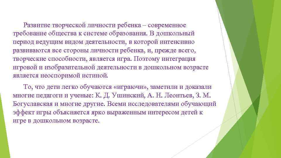 Развитие творческой личности ребенка – современное требование общества к системе образования. В дошкольный период ведущим видом деятельности, в которой интенсивно развиваются все стороны личности ребенка, и, прежде всего, творческие способности, является игра. Поэтому интеграция игровой и изобразительной деятельности в дошкольном возрасте является неоспоримой истиной. То, что дети легко обучаются «играючи» , заметили и доказали многие педагоги и ученые: К. Д. Ушинский, А. Н. Леонтьев, З. М. Богуславская и многие другие. Всеми исследователями обучающий эффект игры объясняется ярко выраженным интересом детей к игре в дошкольном возрасте.