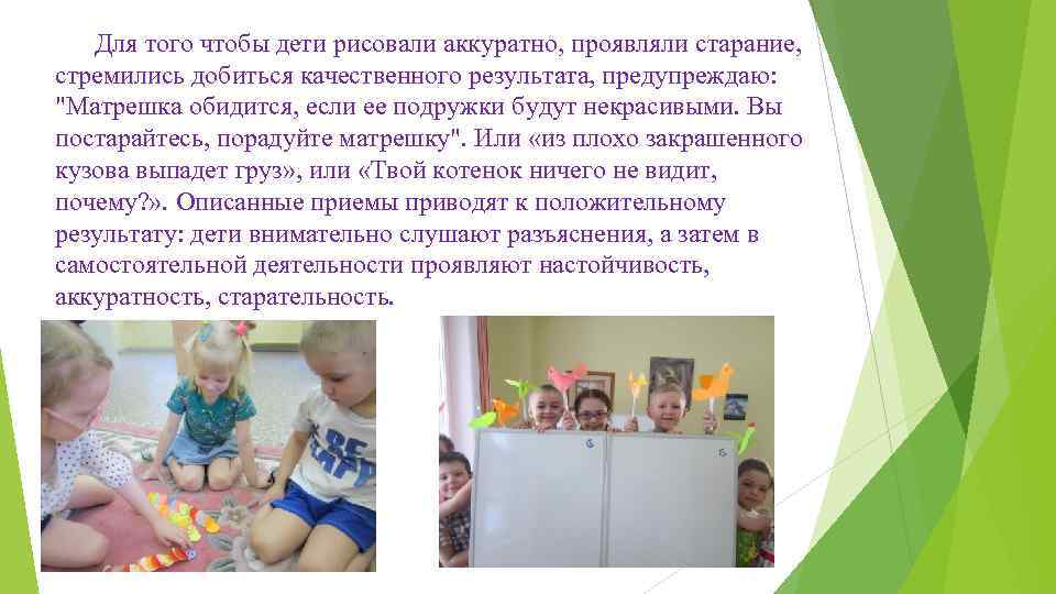 Для того чтобы дети рисовали аккуратно, проявляли старание, стремились добиться качественного результата, предупреждаю: "Матрешка обидится, если ее подружки будут некрасивыми. Вы постарайтесь, порадуйте матрешку". Или «из плохо закрашенного кузова выпадет груз» , или «Твой котенок ничего не видит, почему? » . Описанные приемы приводят к положительному результату: дети внимательно слушают разъяснения, а затем в самостоятельной деятельности проявляют настойчивость, аккуратность, старательность.