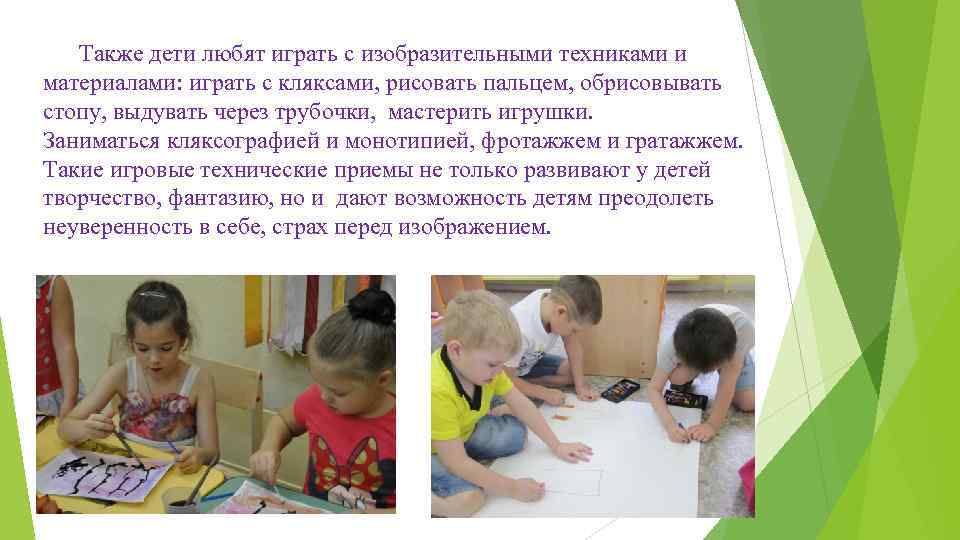 Также дети любят играть с изобразительными техниками и материалами: играть с кляксами, рисовать пальцем, обрисовывать стопу, выдувать через трубочки, мастерить игрушки. Заниматься кляксографией и монотипией, фротажжем и гратажжем. Такие игровые технические приемы не только развивают у детей творчество, фантазию, но и дают возможность детям преодолеть неуверенность в себе, страх перед изображением.