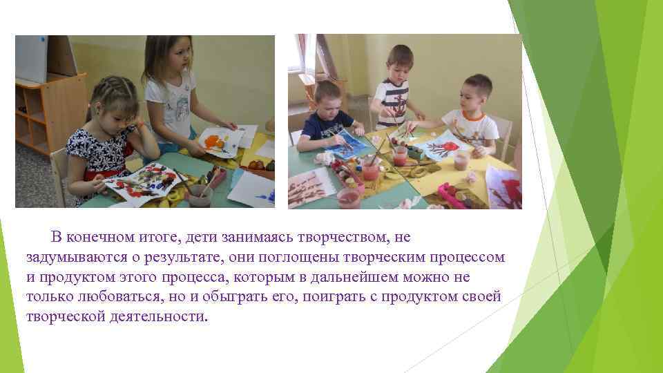 В конечном итоге, дети занимаясь творчеством, не задумываются о результате, они поглощены творческим процессом и продуктом этого процесса, которым в дальнейшем можно не только любоваться, но и обыграть его, поиграть с продуктом своей творческой деятельности.