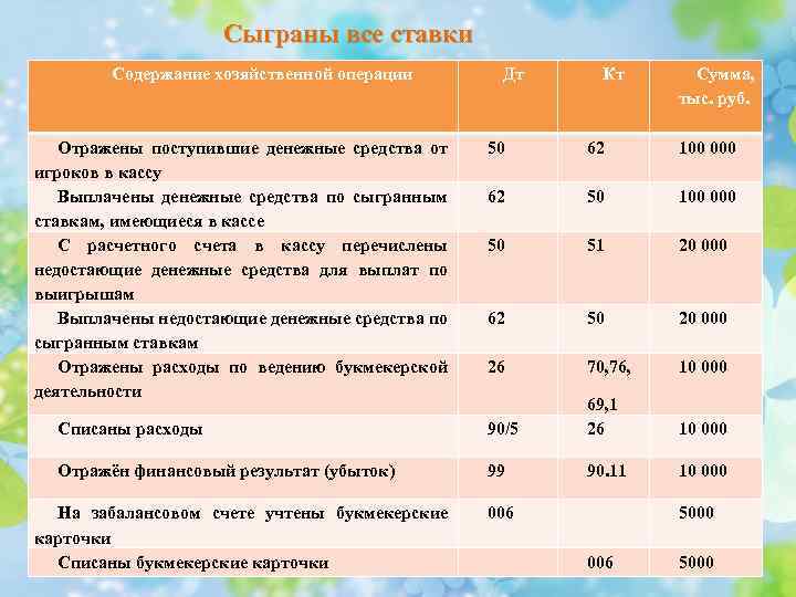 Сыграны все ставки Содержание хозяйственной операции Отражены поступившие денежные средства от игроков в кассу Выплачены денежные средства по сыгранным ставкам, имеющиеся в кассе С расчетного счета в кассу перечислены недостающие денежные средства для выплат по выигрышам Выплачены недостающие денежные средства по сыгранным ставкам Отражены расходы по ведению букмекерской деятельности Дт Кт Сумма, тыс. руб. 50 62 100 000 62 50 100 000 50 51 20 000 62 50 20 000 26 70, 76, 10 000 Списаны расходы 90/5 69, 1 26 10 000 Отражён финансовый результат (убыток) 99 90. 11 10 000 На забалансовом счете учтены букмекерские карточки Списаны букмекерские карточки 006 5000