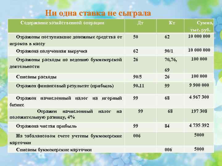 Ни одна ставка не сыграла Содержание хозяйственной операции Отражены поступившие денежные средства от игроков в кассу Отражена полученная выручка 50 62 Сумма, тыс. руб. 10 000 62 90/1 10 000 Отражены расходы по ведению букмекерской деятельности 26 70, 76, 100 000 Списаны расходы 90/5 69 26 100 000 Отражен финансовый результат (прибыль) 90. 11 99 9 900 000 99 68 4 967 300 Отражен начисленный налог на игорный бизнес Отражен начисленный налог на положительную разницу, 4% Отражена чистая прибыль На забалансовом счете учтены букмекерские карточки Списаны букмекерские карточки Дт 99 99 Кт 68 84 197 308 4 735 392 5000 006 5000