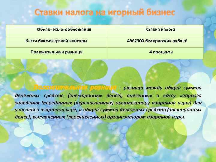 Ставки налога на игорный бизнес Объект налогообложения Касса букмекерской конторы Положительная разница Ставка налога 4967300 белорусских рублей 4 процента - разница между общей суммой денежных средств (электронных денег), внесенных в кассу игорного заведения (переданных (перечисленных) организатору азартной игры) для участия в азартной игре, и общей суммой денежных средств (электронных денег), выплаченных (перечисленных) организатором азартной игры.