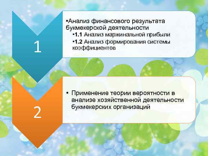 • Анализ финансового результата букмекерской деятельности 1 2 • 1. 1 Анализ маржинальной прибыли • 1. 2 Анализ формирования системы коэффициентов • Применение теории вероятности в анализе хозяйственной деятельности букмекерских организаций