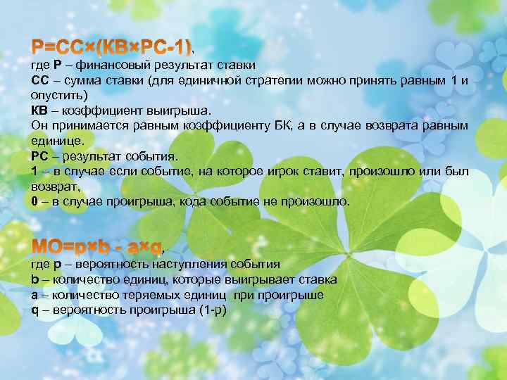 Р=СС×(КВ×РС-1), где Р – финансовый результат ставки СС – сумма ставки (для единичной стратегии можно принять равным 1 и опустить) КВ – коэффициент выигрыша. Он принимается равным коэффициенту БК, а в случае возврата равным единице. РС – результат события. 1 – в случае если событие, на которое игрок ставит, произошло или был возврат, 0 – в случае проигрыша, кода событие не произошло. МО=p×b - a×q, где p – вероятность наступления события b – количество единиц, которые выигрывает ставка a – количество теряемых единиц при проигрыше q – вероятность проигрыша (1 -p)