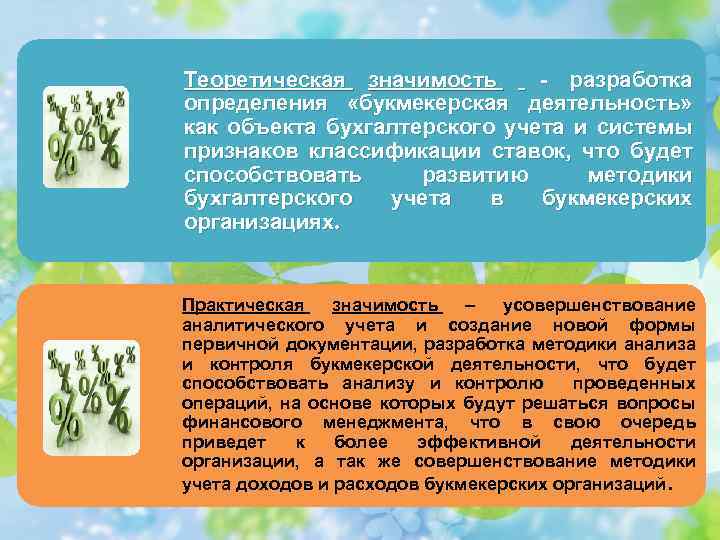 Теоретическая значимость - разработка определения «букмекерская деятельность» как объекта бухгалтерского учета и системы признаков классификации ставок, что будет способствовать развитию методики бухгалтерского учета в букмекерских организациях. Практическая значимость – усовершенствование аналитического учета и создание новой формы первичной документации, разработка методики анализа и контроля букмекерской деятельности, что будет способствовать анализу и контролю проведенных операций, на основе которых будут решаться вопросы финансового менеджмента, что в свою очередь приведет к более эффективной деятельности организации, а так же совершенствование методики учета доходов и расходов букмекерских организаций.