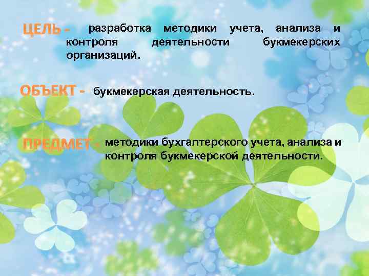 ЦЕЛЬ - разработка методики учета, анализа и контроля деятельности букмекерских организаций. ОБЪЕКТ - букмекерская деятельность. ПРЕДМЕТ - методики бухгалтерского учета, анализа и контроля букмекерской деятельности.