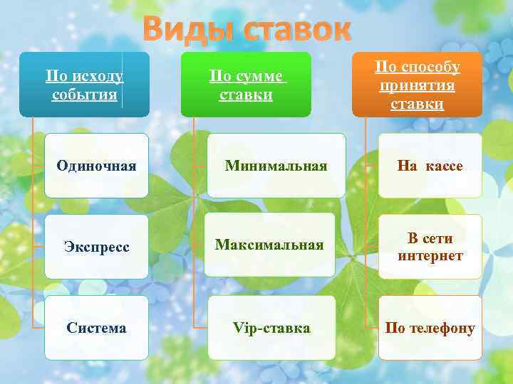Виды ставок По исходу события Одиночная По сумме ставки По способу принятия ставки Минимальная На кассе Экспресс Максимальная В сети интернет Система Vip-ставка По телефону