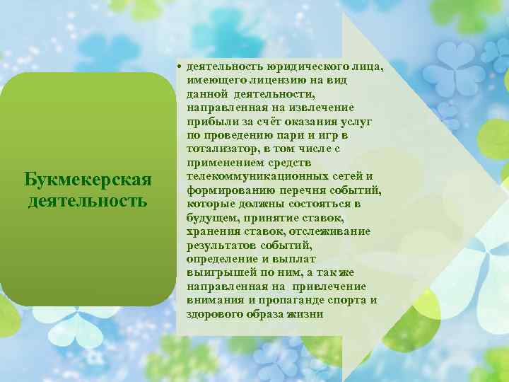 Букмекерская деятельность • деятельность юридического лица, имеющего лицензию на вид данной деятельности, направленная на извлечение прибыли за счёт оказания услуг по проведению пари и игр в тотализатор, в том числе с применением средств телекоммуникационных сетей и формированию перечня событий, которые должны состояться в будущем, принятие ставок, хранения ставок, отслеживание результатов событий, определение и выплат выигрышей по ним, а так же направленная на привлечение внимания и пропаганде спорта и здорового образа жизни