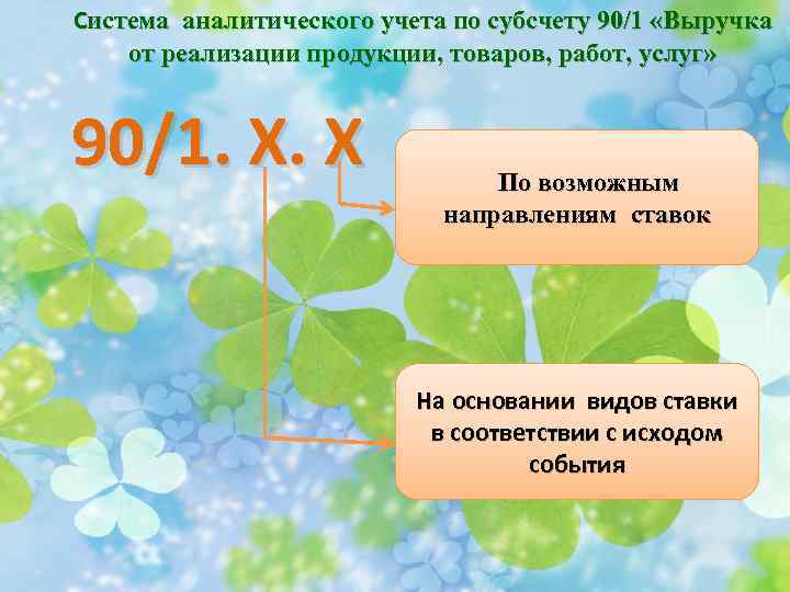 Система аналитического учета по субсчету 90/1 «Выручка от реализации продукции, товаров, работ, услуг» 90/1. Х. Х По возможным направлениям ставок На основании видов ставки в соответствии с исходом события