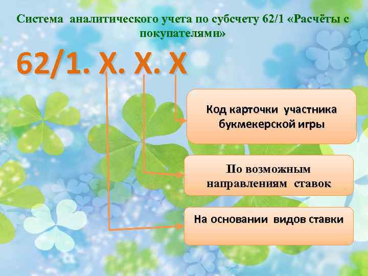 Система аналитического учета по субсчету 62/1 «Расчёты с покупателями» 62/1. Х. Х. Х Код карточки участника букмекерской игры По возможным направлениям ставок На основании видов ставки