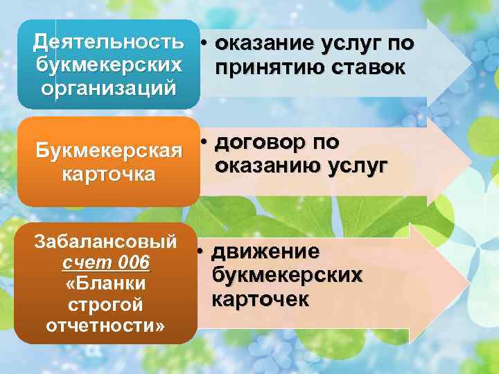 Деятельность • оказание услуг по букмекерских принятию ставок организаций Букмекерская • договор по оказанию услуг карточка Забалансовый • движение счет 006 букмекерских «Бланки карточек строгой отчетности»