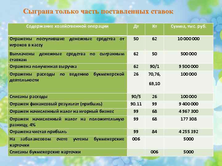 Сыграна только часть поставленных ставок Содержание хозяйственной операции Дт Кт Сумма, тыс. руб. Отражены поступившие денежные средства от игроков в кассу 50 62 10 000 Выплачены денежные средства по сыгранным ставкам Отражена полученная выручка 62 50 500 000 62 90/1 9 500 000 Отражены расходы по ведению букмекерской деятельности 26 70, 76, 100 000 69, 10 Списаны расходы 90/5 26 100 000 Отражен финансовый результат (прибыль) 90. 11 99 9 400 000 Отражен начисленный налог на игорный бизнес 99 68 4 967 300 Отражен начисленный налог на положительную разницу, 4% Отражена чистая прибыль 99 68 177 308 99 84 4 255 392 На забалансовом счете учтены букмекерские карточки Списаны букмекерские карточки 006 5000
