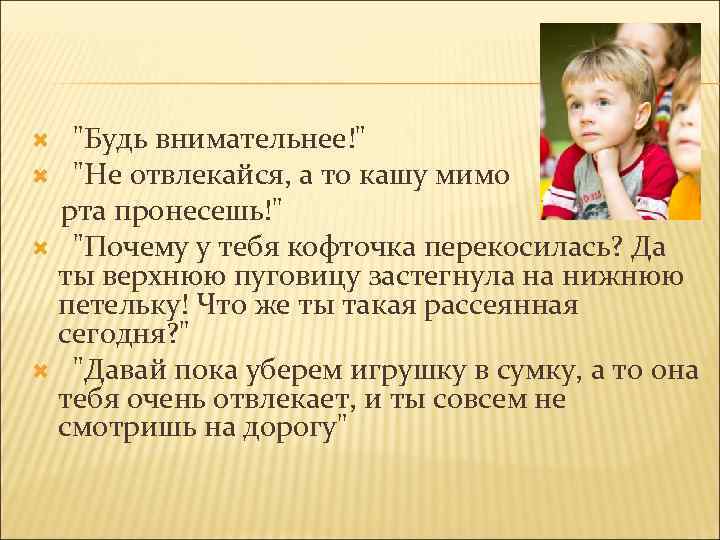 "Будь внимательнее!" "Не отвлекайся, а то кашу мимо рта пронесешь!" "Почему у тебя кофточка перекосилась? Да ты верхнюю пуговицу застегнула на нижнюю петельку! Что же ты такая рассеянная сегодня? " "Давай пока уберем игрушку в сумку, а то она тебя очень отвлекает, и ты совсем не смотришь на дорогу"