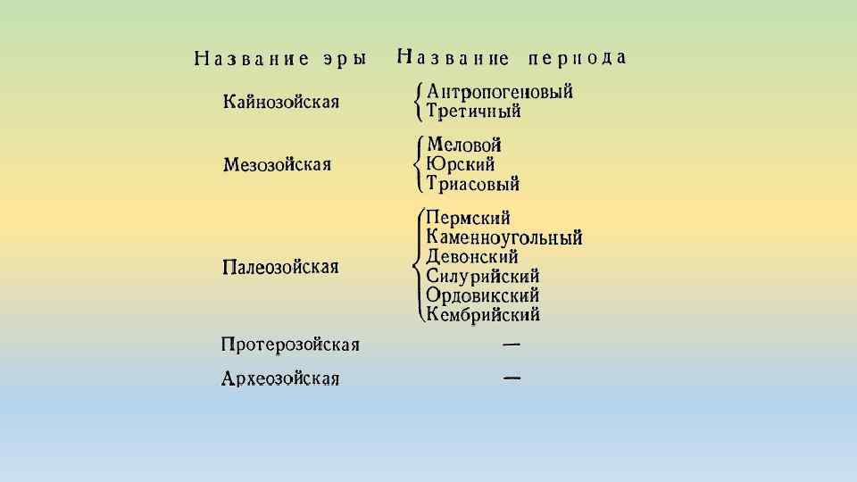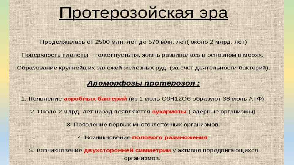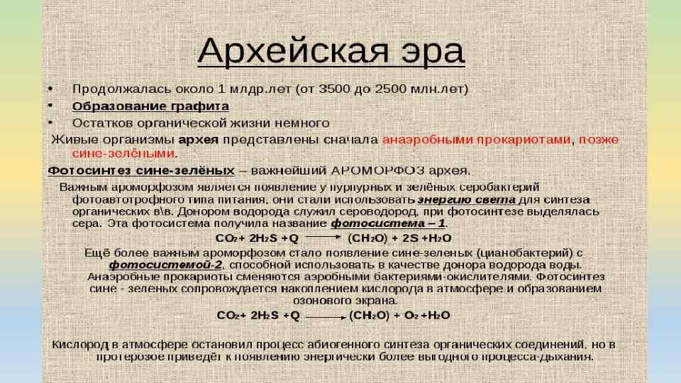 Архейская эра (архей) • Начало: 3500 млн. лет назад • Климат: активная вулканическая деятельность, бескислородные условия жизни в мелководном море, развитие кислородной атмосферы