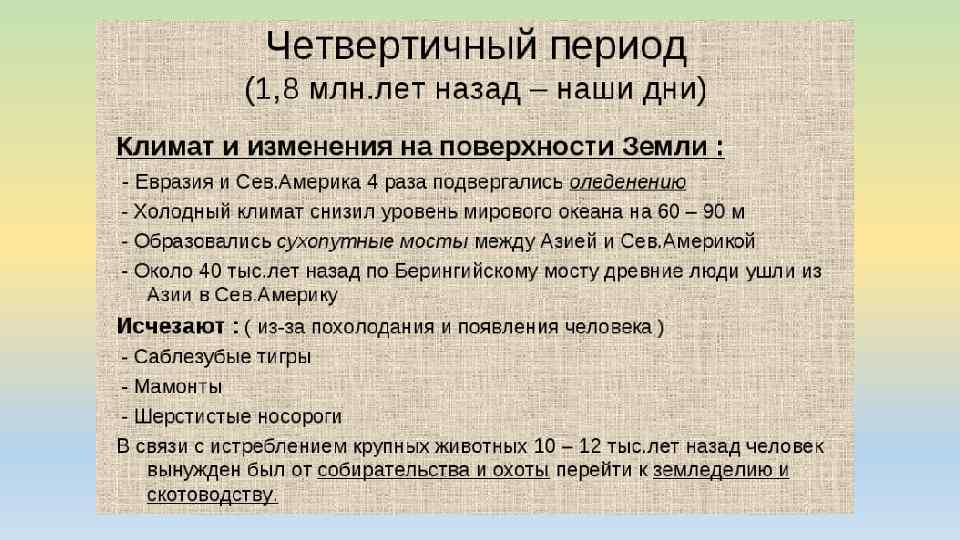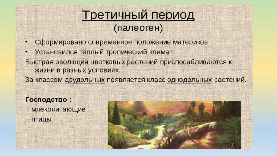 Кайнозойская эра • Начало: 65 млн. лет назад • Климат: процессы альпийской складчатости достигают кульминационного пункта, в последующие эпохи земная поверхность постепенно приобретает современные очертания.