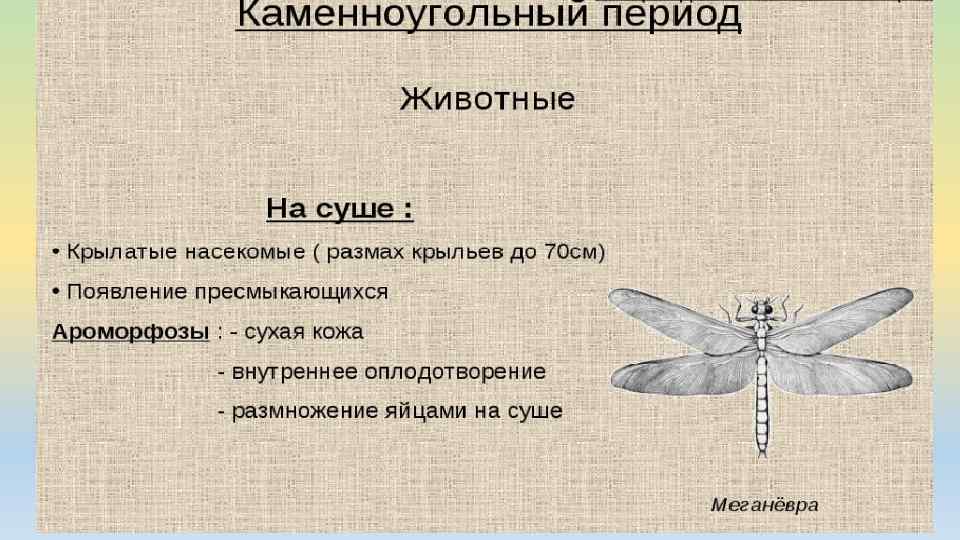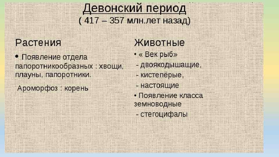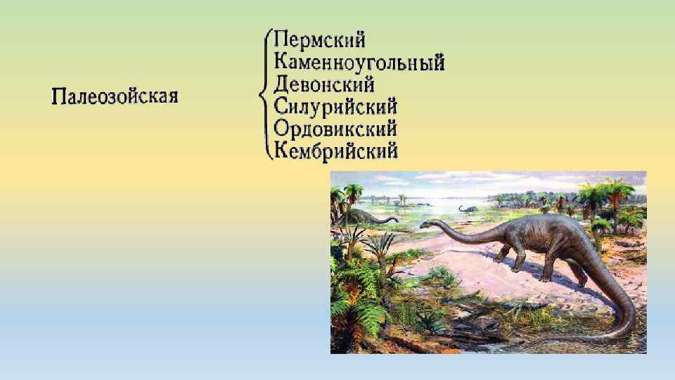 Палеозойская эра • Начало: 570 млн. лет назад • Климат: активное горообразование, наступления и отступления моря, оледенения сменяются потеплениями, сухой климат влажным. В конце эры – образование болот и рифов. На суше Болото