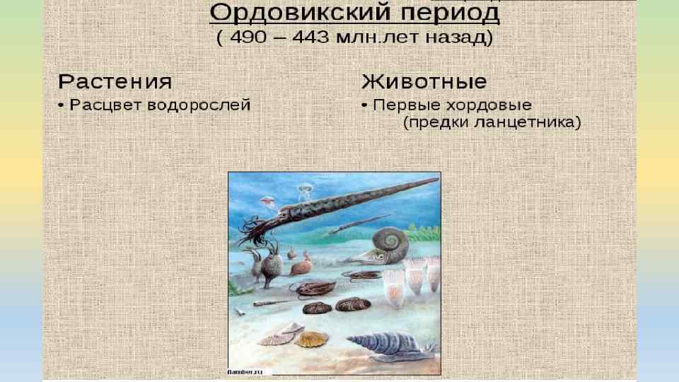 Обитатели протерозоя • Растения: одноклеточные и многоклеточные водоросли • Животные: одноклеточные, кишечнополостные, черви, моллюски, первые хордовые. Отложения протерозоя, найденные в Австралии Раковинный моллюск