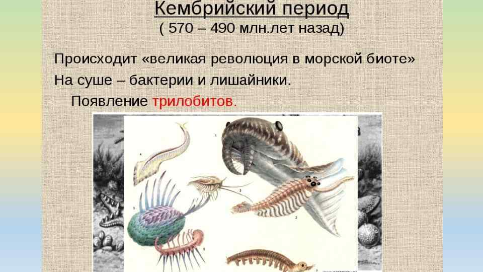 Жизнь в океане протерозоя Широко распространены простейшие, губки, черви, предки трилобитов и иглокожих; предположительно – первые представители хордовых - бесчерепные Распространены преимущественно одноклеточные зеленые водоросли