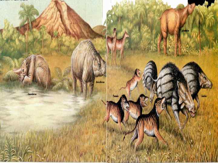Неогеновый период олигоцен от 38 до 25 млн. лет назад ГЕОГРАФИЯ и КЛИМАТ: Индия пересекла экватор, а Австралия наконец-то отделилась от Антарктиды. Климат на Земле стал прохладнее, над Южным полюсом сформировался громадный ледниковый покров. ЖИВОТНЫЙ МИР: С распространением степей начался бурный расцвет травоядных млекопитающих. Среди них возникли новые виды кроликов, зайцев, гигантских ленивцев, носорогов и прочих копытных. Появились первые жвачные. РАСТИТЕЛЬНЫЙ МИР: Тропические леса ум начали уступать место лесам умеренного пояса, появились и обширные степи. Быстро распространялись новые травы. .