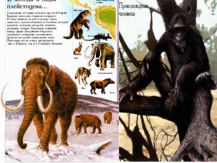 Антропогеновый период плейстоцен от 2 до 0, 01 млн. лет ГЕОГРАФИЯ и КЛИМАТ: Материки занимали то же положение, что и в наши дни. Австралия располагалась на противоположной от Британии стороне Земли. На северное полушарие наползали гигантские ледниковые покровы. Это была эпоха великого оледенения с чередованием периодов похолодания и потепления. ЖИВОТНЫЙ МИР: Некоторые животные обзавелись густой шерстью: к примеру, шерстистые мамонты и носороги. Из хищников распространены саблезубые кошки и пещерные львы. Это был век гигантских сумчатых в Австралии. Появились первые люди. РАСТИТЕЛЬНЫЙ МИР: Хвойные леса уступали место тундре. Дальше от края ледников уже лиственные леса сменялись хвойными. В более теплых областях земного шара раскинулись обширные степи.