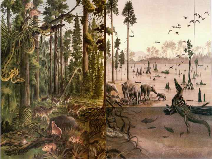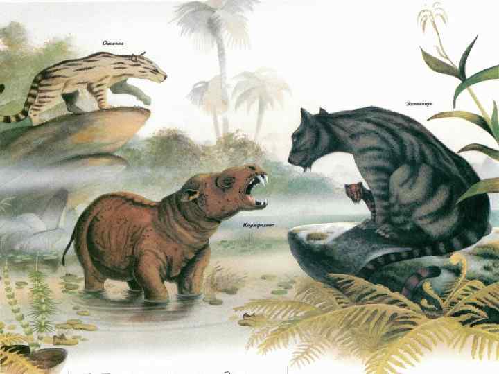 Неогеновый период эоцен от 55 до 38 млн. лет назад ГЕОГРАФИЯ и КЛИМАТ: В эоцене основные массивы суши начали понемногу принимать положение, близкое к тому, которое они занимают в наши дни. Море затопило часть суши. Климат повсеместно был теплым либо умеренным. ЖИВОТНЫЙ МИР: На суше появились летучие мыши; предки нынешних слонов, лошадей, коров, свиней. Млекопитающие, типа китов и сирен, вернулись в водную среду. Эволюционировали и другие группы животных. РАСТИТЕЛЬНЫЙ МИР: Во многих частях света произрастали леса с пышной растительностью, в умеренных широтах росли пальмы.