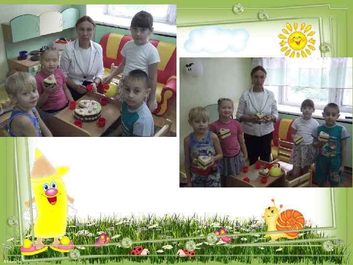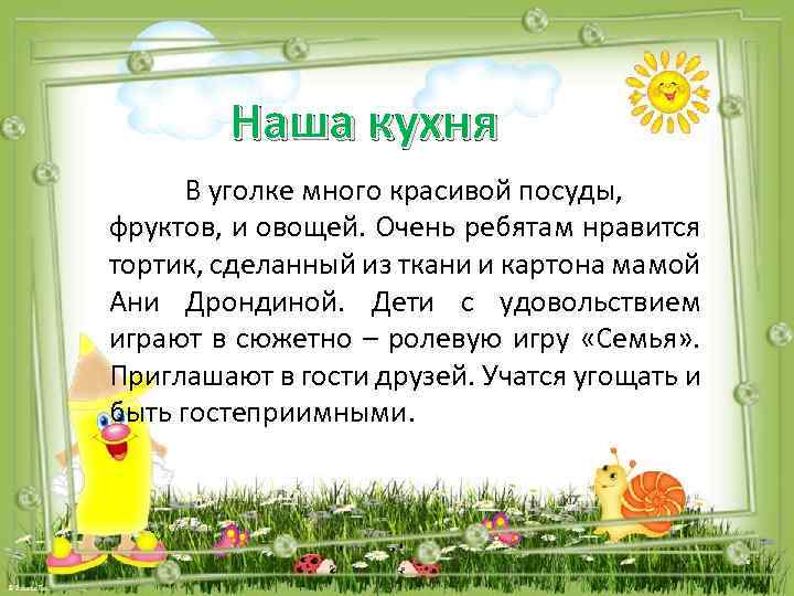 Наша кухня В уголке много красивой посуды, фруктов, и овощей. Очень ребятам нравится тортик, сделанный из ткани и картона мамой Ани Дрондиной. Дети с удовольствием играют в сюжетно – ролевую игру «Семья» . Приглашают в гости друзей. Учатся угощать и быть гостеприимными.