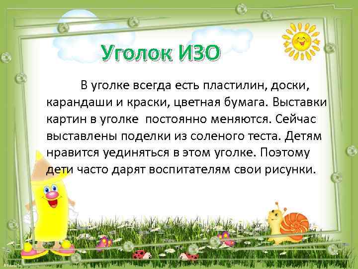 Уголок ИЗО В уголке всегда есть пластилин, доски, карандаши и краски, цветная бумага. Выставки картин в уголке постоянно меняются. Сейчас выставлены поделки из соленого теста. Детям нравится уединяться в этом уголке. Поэтому дети часто дарят воспитателям свои рисунки.