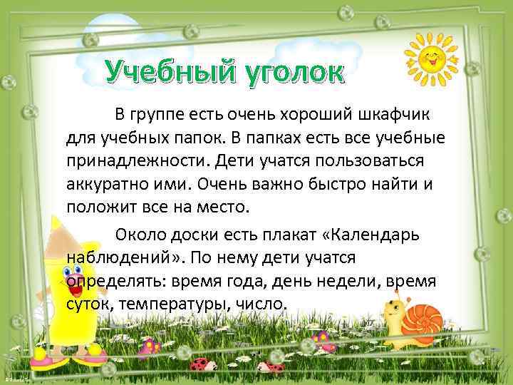 Учебный уголок В группе есть очень хороший шкафчик для учебных папок. В папках есть все учебные принадлежности. Дети учатся пользоваться аккуратно ими. Очень важно быстро найти и положит все на место. Около доски есть плакат «Календарь наблюдений» . По нему дети учатся определять: время года, день недели, время суток, температуры, число.