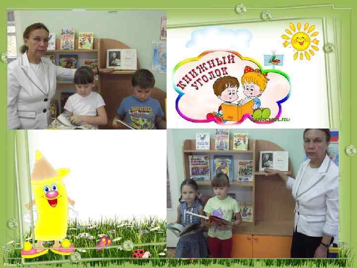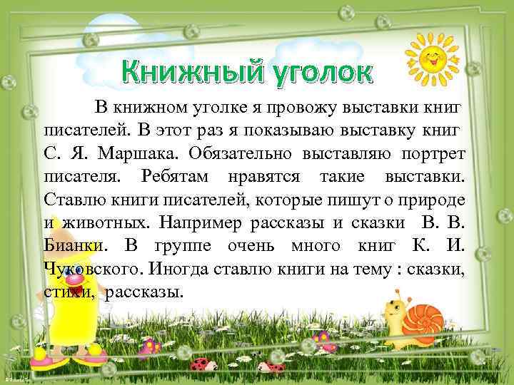 Книжный уголок В книжном уголке я провожу выставки книг писателей. В этот раз я показываю выставку книг С. Я. Маршака. Обязательно выставляю портрет писателя. Ребятам нравятся такие выставки. Ставлю книги писателей, которые пишут о природе и животных. Например рассказы и сказки В. В. Бианки. В группе очень много книг К. И. Чуковского. Иногда ставлю книги на тему : сказки, стихи, рассказы.
