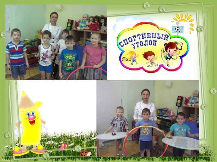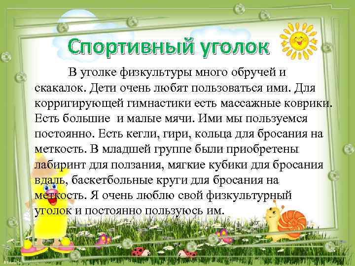 Спортивный уголок В уголке физкультуры много обручей и скакалок. Дети очень любят пользоваться ими. Для корригирующей гимнастики есть массажные коврики. Есть большие и малые мячи. Ими мы пользуемся постоянно. Есть кегли, гири, кольца для бросания на меткость. В младшей группе были приобретены лабиринт для ползания, мягкие кубики для бросания вдаль, баскетбольные круги для бросания на меткость. Я очень люблю свой физкультурный уголок и постоянно пользуюсь им.