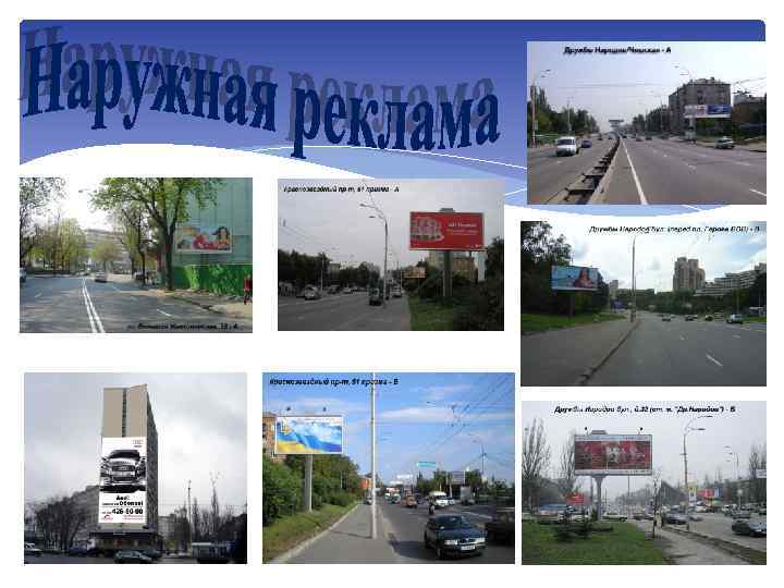 Реклама на больших экранах У нас вы можете заказать рекламу на больших мониторах в центральных районах Киева где находятся ключевые автомобильные развязки и бизнес центры. Данные и другие факторы сами говорят о высокой эффективности данного вида рекламы. БЦ «Макулан» БЦ «Парус» ТЦ «Городок» бул. Шевченко/ул. Владимирская Г-ца «Лыбидь» р-к «Бессарабка»