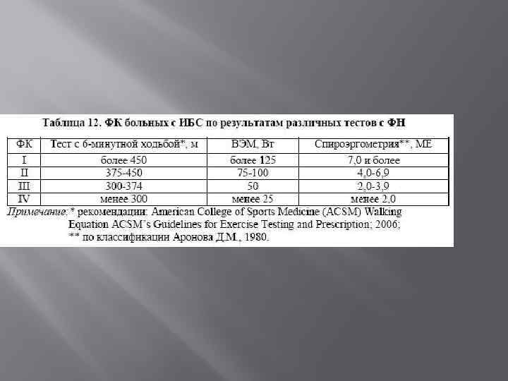Максимальное потребление кислорода (VO 2, мл/кг/мин) можно определить с помощью спироэргометрии. Обычно для характеристики выполненной нагрузки используются МЕ (метаболические единицы), которые можно перевести в потребление кислорода O 2 по формуле: 1 МЕ = 3, 5 мл O 2 /кг/мин. В табл. 12. приведена характеристика ФК больных с ИБС по результатам различных тестов с ФН.