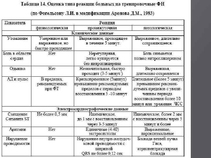 Методы контроля состояния пациента во время ФТ Назначаемая пациенту ФТ должна быть адекватна его функциональному состоянию и не вызывать каких-либо болевых ощущений и дискомфорта (табл. 14). В первые недели занятий ЧСС на высоте ФТ и в первые 3 минуты после не должна превышать исходную более чем на 20 уд/мин, а дыхание – не более чем на 6 в минуту. Допускается повышение (от исходного) систолического АД на 20 -40 мм и диастолического АД - на 10 -12 мм рт. ст. . У отдельных больных, напротив, может наблюдаться урежение пульса (но не более чем на 10 ударов в мин. ) и снижение уровня АД (но не более чем на 10 мм рт. ст. ). Эта реакция является допустимой.
