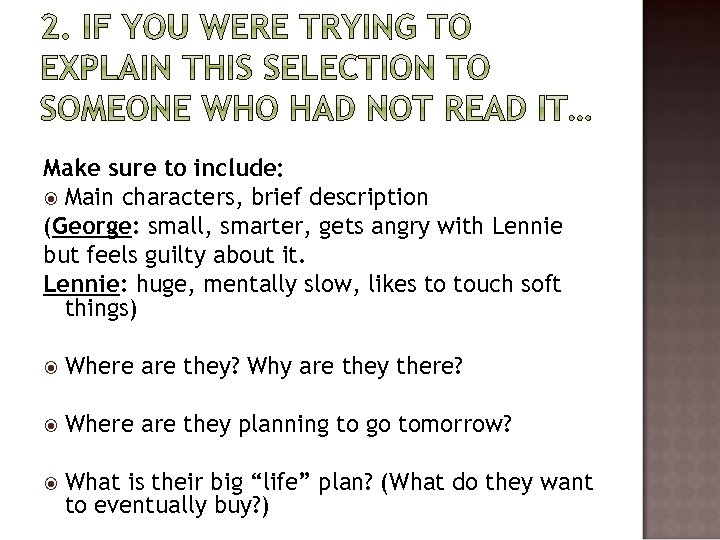 Make sure to include: Main characters, brief description (George: small, smarter, gets angry with Lennie but feels guilty about it. Lennie: huge, mentally slow, likes to touch soft things) Where are they? Why are they there? Where are they planning to go tomorrow? What is their big “life” plan? (What do they want to eventually buy? )