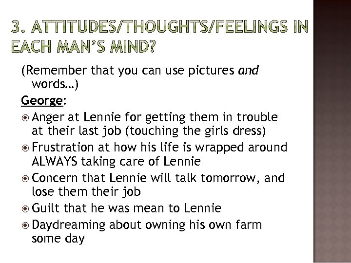 (Remember that you can use pictures and words…) George: Anger at Lennie for getting them in trouble at their last job (touching the girls dress) Frustration at how his life is wrapped around ALWAYS taking care of Lennie Concern that Lennie will talk tomorrow, and lose them their job Guilt that he was mean to Lennie Daydreaming about owning his own farm some day