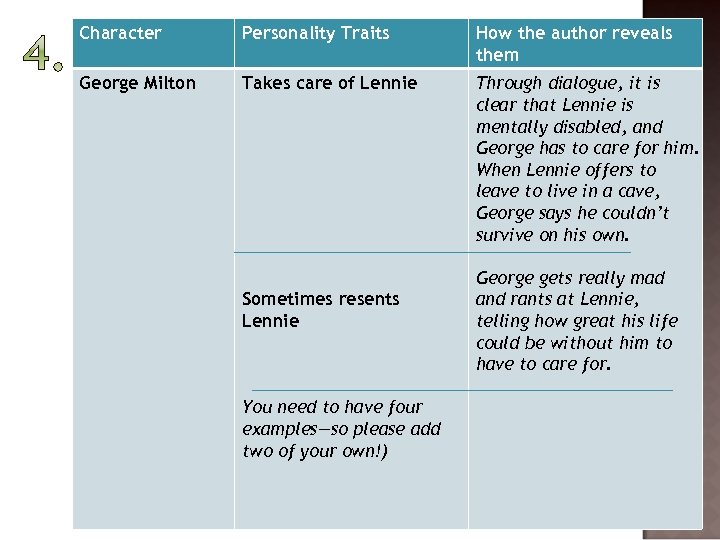 Character Personality Traits How the author reveals them George Milton Takes care of Lennie Through dialogue, it is clear that Lennie is mentally disabled, and George has to care for him. When Lennie offers to leave to live in a cave, George says he couldn’t survive on his own. Sometimes resents Lennie You need to have four examples—so please add two of your own!) George gets really mad and rants at Lennie, telling how great his life could be without him to have to care for.