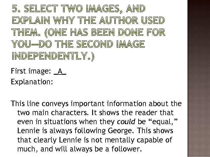 First image: _A_ Explanation: This line conveys important information about the two main characters. It shows the reader that even in situations when they could be “equal, ” Lennie is always following George. This shows that clearly Lennie is not mentally capable of much, and will always be a follower.