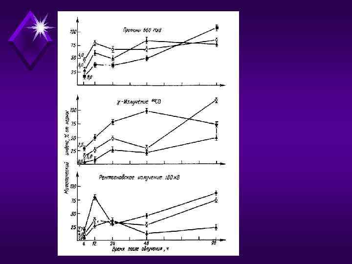 Динамика восстановления митотической активности • Через 4 ч после облучения клеточное деление подавлено, степень угнетения пропорциональна дозе. Восстановление митотической активности клетки происходит волнообразно, причем картина при всех использованных видах ионизирующих излучений однотипна.