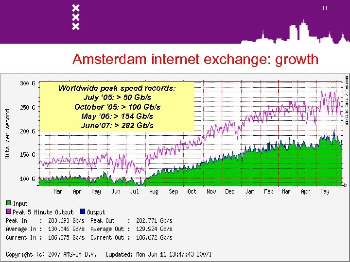 11 Amsterdam internet exchange: growth Worldwide peak speed records: July ‘ 05: > 50 Gb/s October ’ 05: > 100 Gb/s May ’ 06: > 154 Gb/s June’ 07: > 282 Gb/s