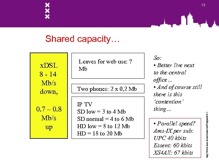 13 x. DSL 8 - 14 Mb/s down, 0. 7 – 0. 8 Mb/s up Leaves for web use: ? Mb Two phones: 2 x 0, 2 Mb IP TV SD low = 3 to 4 Mb SD normal = 4 to 6 Mb HD low = 8 to 12 Mb HD = 18 to 20 Mb So: • Better live next to the central office… • And of course still there is this ‘contention’ thing… • Parallel speed? Ams-IX per sub: UPC 40 kbits Essent: 60 kbits XS 4 All: 67 kbits http: //www. ams-ix. net/connected/? expanded=1 Shared capacity…