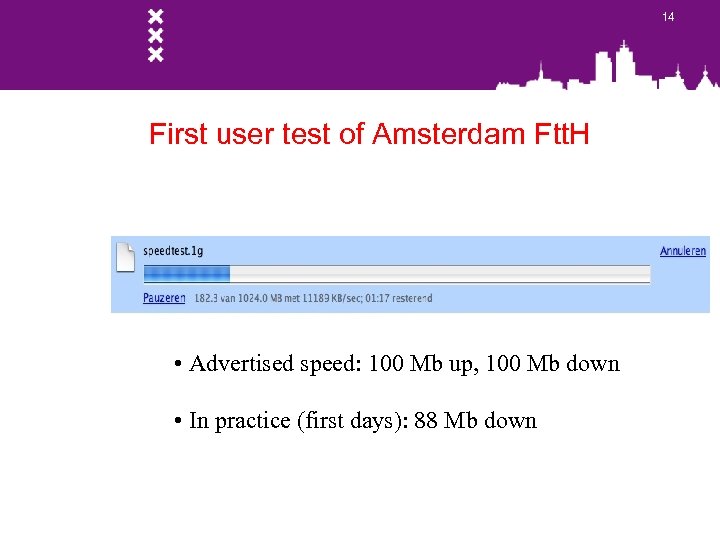 14 First user test of Amsterdam Ftt. H • Advertised speed: 100 Mb up, 100 Mb down • In practice (first days): 88 Mb down