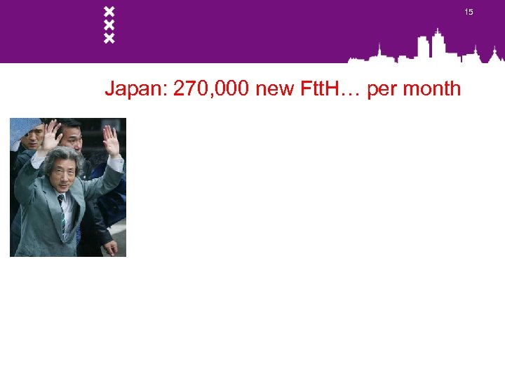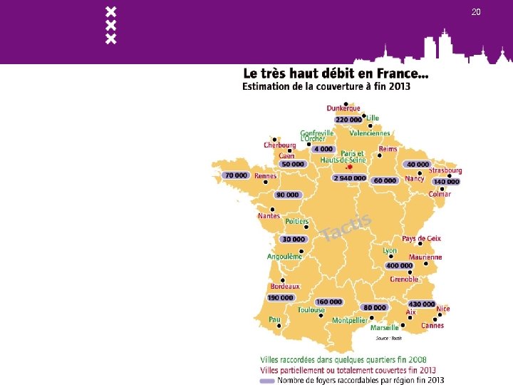 19 Hauts-de-Seine: 700, 000 connections § Western part of Greater Paris – pop. 1. 5 million, 100. 000 SME’s, 880. 000 jobs, 85% in services – Per capita highest income of France § 2005, adoption of proposal by the Chairman of the Conseil General – Ftt. H to all population and companies – With a maximum subsidy of euro 70 million § Said Sarkozy: “Copper is not gonna cut it, we need fiber”