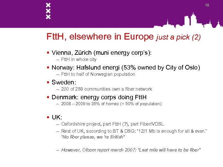 17 Ftt. H, elsewhere in Europe just a pick (1) § France, the battle for & around Paris – Iliad: 1 million Ftt. H at 1 billion Euro investment (City of Paris supporting) – Neuf Cegetel: in 2009 we want 250, 000 Ftt. H (50 Mbits) at euro 29, 90 – France Telecom, 2007: Ftt. H (100/10 Mbits at euro 44, 90) in Paris, Poitiers, Marseille, Lille, Toulouse & Lyon. Target: 200, 000 subs end 2008 – Noos Numericable, march 2007: “Massive investment towards Ftt. H” – over 100 broadband projects France with communal participation – Nov. 2006, French government: 4 million Ftt. H in 2012 § Germany: competitive teleco’s announcing Ftt. H – f. e. Net. Cologne: all of Cologne, to be followed by Bonn, Aachen? (Net. Cologne = 100% GEW Köln AG = 100% City of Cologne) – Other projects in Schwerte, Norderstedt, Hamburg, Gelsenkirchen, Dessau, Magdeburg