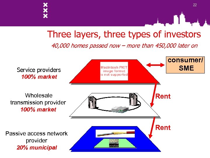 22 Three layers, three types of investors 40, 000 homes passed now – more than 450, 000 later on Service providers 100% market Wholesale transmission provider 100% market Passive access network provider 20% municipal consumer/ SME Rent